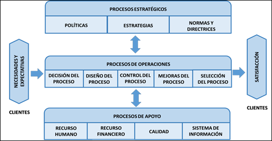 La gestión por procesos es un conjunto de procedimientos o esquemas que permite organizar los esfuerzos y la utilización de los recursos para lograr la satisfacción de aquello que está vinculado con los procesos que definen al sistema organizacional. Dichos procedimientos o esquemas requieren que todas las partes que lo componen, se caractericen por crear relaciones coordinadas, para lograr niveles de eficacia, eficiencia y efectividad, que cumplan con los elementos básicos de la gestión de calidad y productividad que es alcanzar los requerimientos de los clientes en los tiempos establecidos y a los costos presupuestados. Estos procedimientos se dividen en estratégicos, operativos o clave y de apoyo tal como se describe en la figura 1.